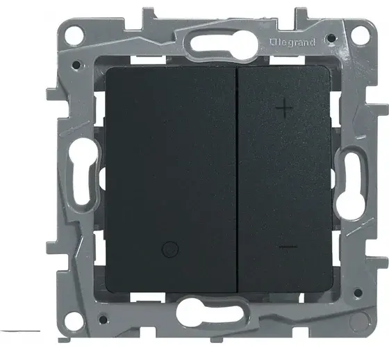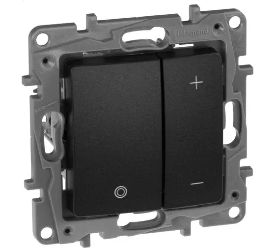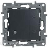 Нажимной светорегулятор Legrand Etika 20-400 Вт, с кнопкой включения/выключения, а также клавишей для регулирования яркости. Предназначен для использования с лампами накаливания, галогенными лампами, электронным или ферромагнитным трансформатором.