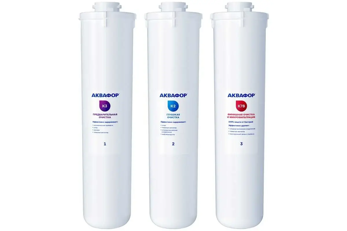В комплекте три картриджа: K3, K2 и K7B. Они задерживают частицы размером больше 5, 0,8 и 0,1 микрон соответственно. Картридж K7B очищает воду от бактерий и паразитов. Половину объема занимает мембрана с порами в 1000 раз тоньше человеческого волоса. Все три картриджа поглощают из воды вредные примеси: хлор, железо, свинец и другие тяжелые металлы, нефтепродукты, пестициды и другие органические соединения.