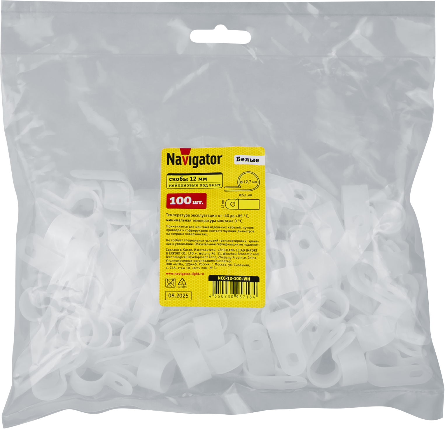 Скобы нейлоновые с отверстием под винт Navigator серии NCC предназначены для монтажа отдельных кабелей и пучков проводов на твердых поверхностях при помощи саморезов или винтов. Применяются при прокладке кабельных трасс по поверхности стен, пола и потолка. Подходят как для бытового применения, так и для использования на производственных объектах