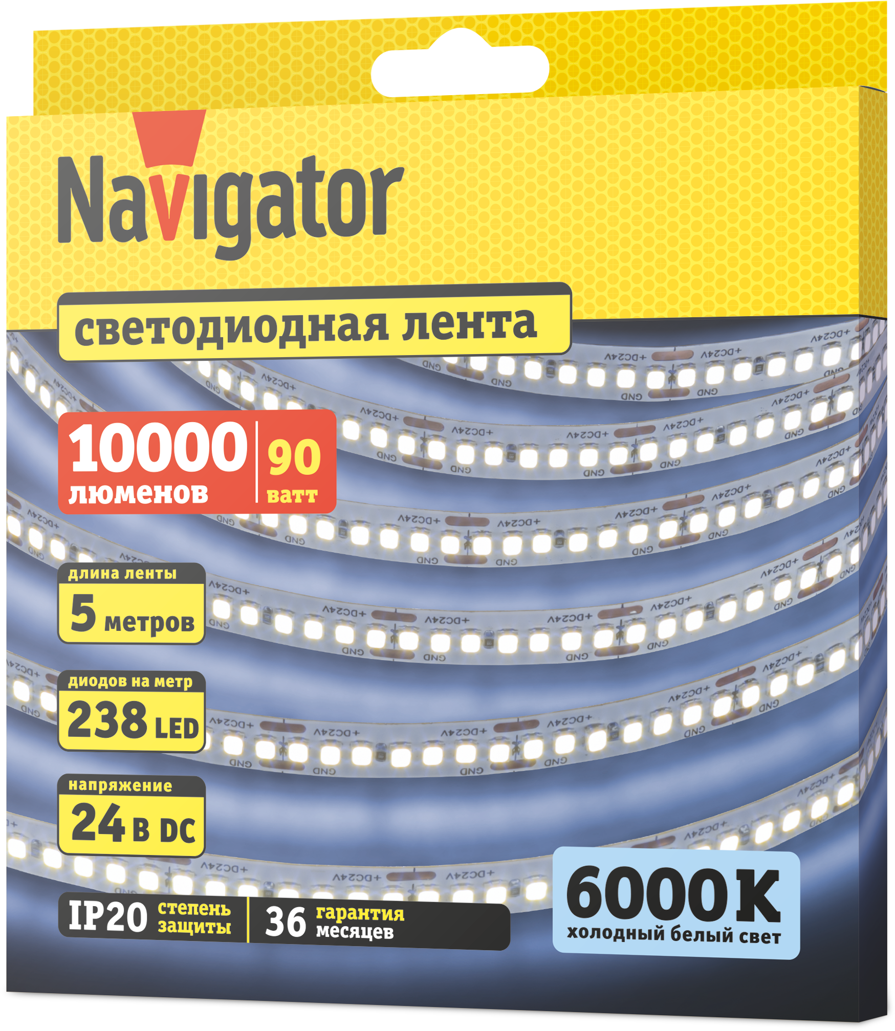 Лента Navigator 24V СД2835 18Вт 6000К IP20 бухта 5м белая легко крепится к различным поверхностям, а благодаря гибкости и отсутствию нагрева во время работы ей можно декорировать разнообразные конструкции и предметы, разрезая на участки необходимой длины.