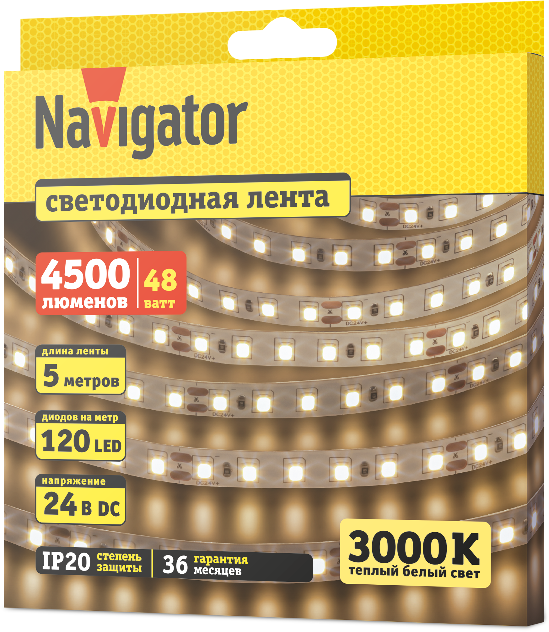 Лента Navigator 24V СД2835 9,6Вт 3000К IP20 бухта 5м белая легко крепится к различным поверхностям, а благодаря гибкости и отсутствию нагрева во время работы ей можно декорировать разнообразные конструкции и предметы, разрезая на участки необходимой длины.