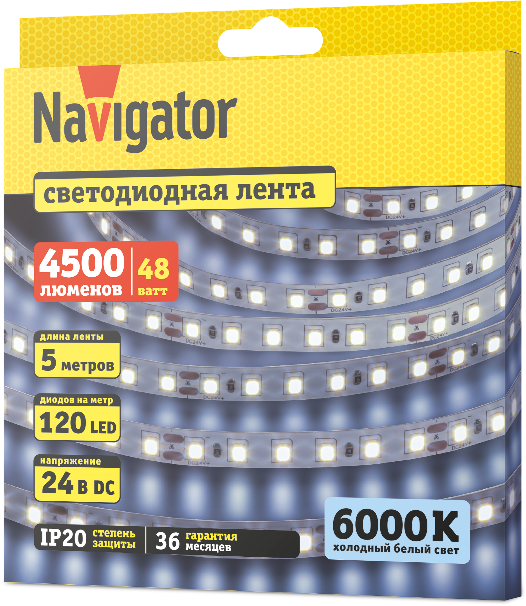 Лента Navigator 24V СД2835 9,6Вт 6000К IP20 бухта 5м белая легко крепится к различным поверхностям, а благодаря гибкости и отсутствию нагрева во время работы ей можно декорировать разнообразные конструкции и предметы, разрезая на участки необходимой длины.
