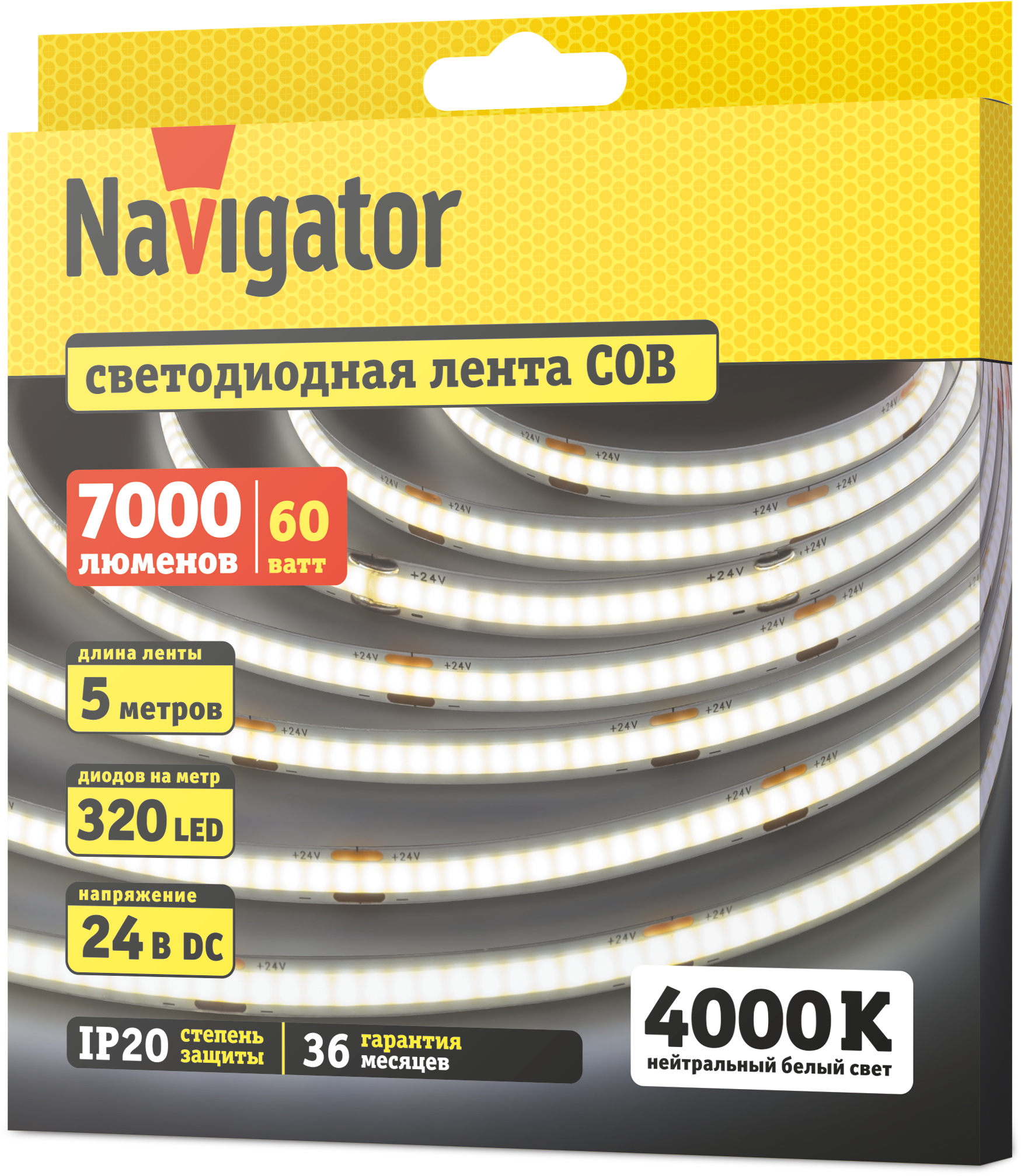 Лента Navigator 24V СОВ 12Вт 4000К IP20 бухта 5м белая легко крепится к различным поверхностям, а благодаря гибкости и отсутствию нагрева во время работы ей можно декорировать разнообразные конструкции и предметы, разрезая на участки необходимой длины.