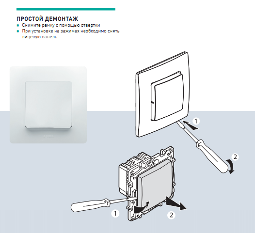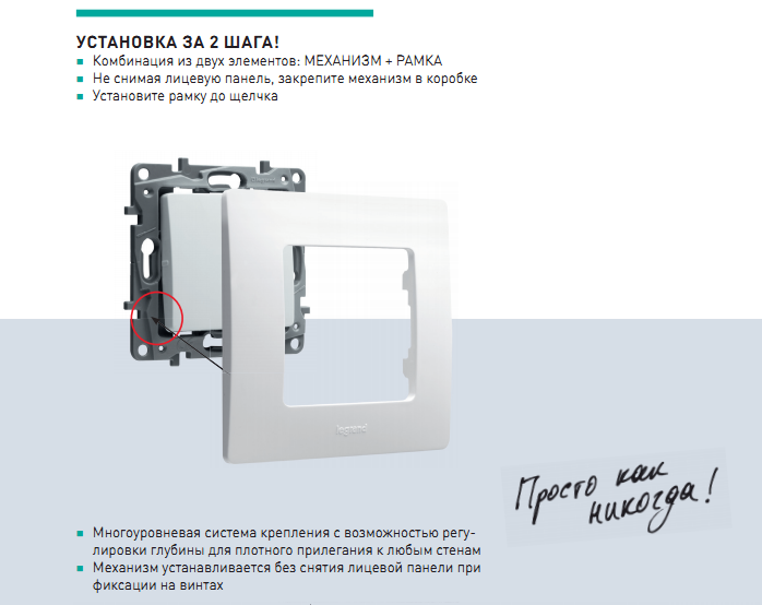 - Механизм нового поколения Etika: подключение кабеля с помощью безвинтовых зажимов (кроме промежуточного переключателя и 3-клавишного выключателя)