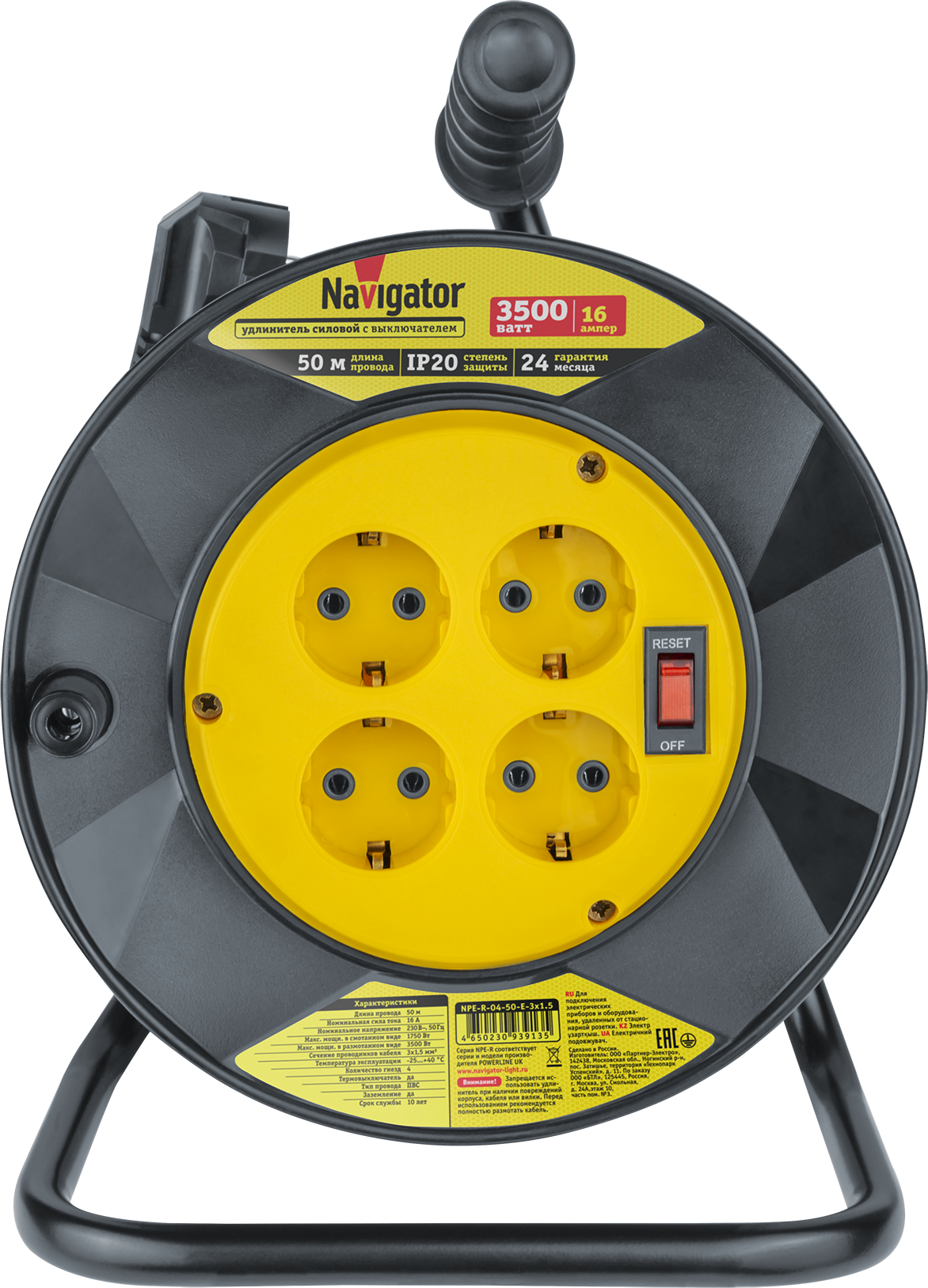 Устойчивая стальная рама c прорезиненной эргономичной ручкой для переноски. Катушка из полипропилена с рукояткой для сматывания кабеля. Прочный и гибкий ПВС провод ГОСТ 7399-97. Литая неразборная вилка для безопасного соединения. Подключение от 1 до 4 электроприборов одновременно. Термовыключатель (автоматический предохранитель) для защиты удлинителя от перегрева при превышении мощности нагрузки. Максимальная нагрузка в размотанном/смотанном виде 3500/1750 Вт. Срок службы 10 лет.